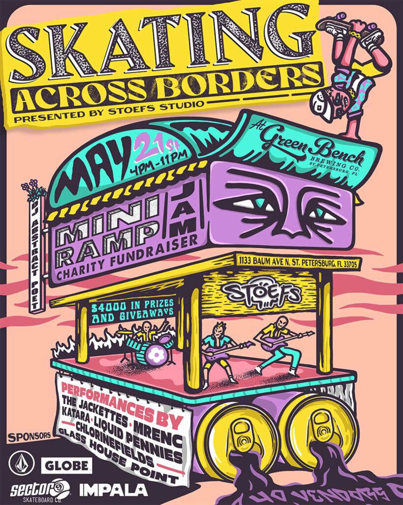 Presented by the Stoefs Studio in cooperation with the Skatepark of Tampa, the fundraiser features a mini ramp jam as well as live band performances.